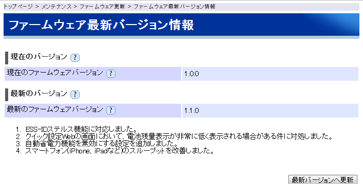 | 2. | クイック設定Webの画面において、電池残量表示が非常に低く表示される場合がある件に対処しました。 |