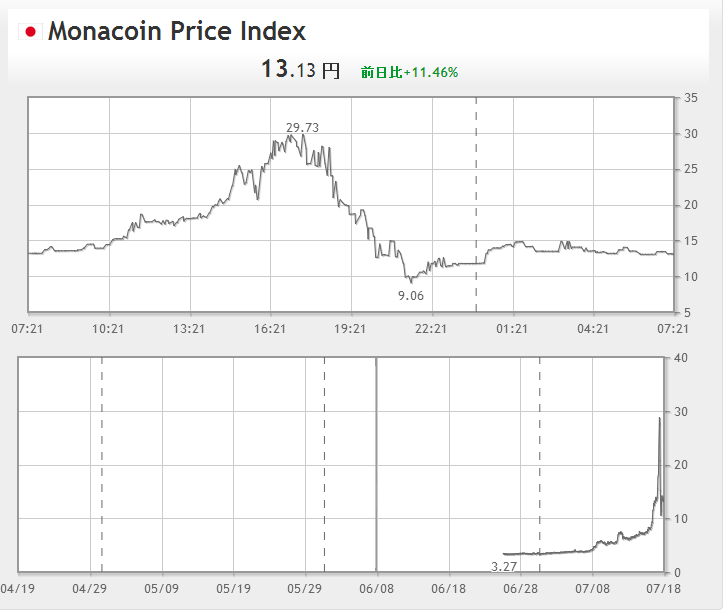 モナーコイン、difficultyの上昇と 謎の祭。#monacoin by しおんぐ · 2014年7月18日 本ページはアフィリエイトプログラムによる収益を得ています。 Tweet Pocket 7/17 11時のごろから上昇し始め20時ごろには収束してしまった「謎の祭」があった 長い間 一桁円で推移していたMonacoinが 17日16時ごろ と突然30円近い価格を付けた。 その後も 10~15円を推移しており 急激に上昇 その上昇もさることながら coin発掘の難易度であるdifficultyが 上昇し続けている。 関連記事:モナコインがついに1000円突破。一時1400円以上に。【仮想通貨】monacoinの価格とDifficultyの急上昇っぷりが半端ない。老舗暗号通貨取引サイト「もなとれ」が取引休止中、大手取引所がmonacoin対応し始めた影響か?monacoinが価格上昇とともに Diffが急上昇。GPUでの発掘は困難に #monacoin仮想通貨(monacoin)の発掘をはじめてみた。セリア TypeCケーブル+HUAWEI P9を試す。Docomo、dtab Compact d-02Kが予約受付開始。ドコモでシステム障害。各種手続きが行えない状態。(復旧済み) Tweet Pocket
