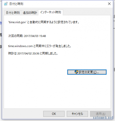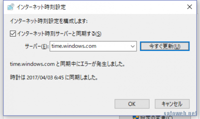 設定→日付と時刻→日付時刻地域の追加設定→日付時刻の設定→インターネット時刻