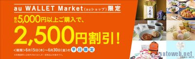 2017年6月15日から2017年6月30日の期間中の平日に、「au WALET Market (auショップ) 」の商品を5,000円以上ご購入いただくと、その場で2,500円の割引を行う「auでよかった割引」キャンペーンを実施します。