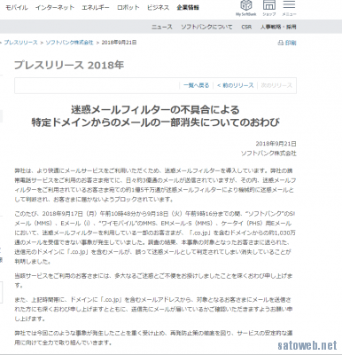 情報源: 迷惑メールフィルターの不具合による特定ドメインからのメールの一部消失についてのおわび | プレスリリース | ニュース | 企業情報 | ソフトバンク