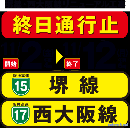 阪神高速、堺線・西大阪線、リニューアル工事で11/2~12通行止め