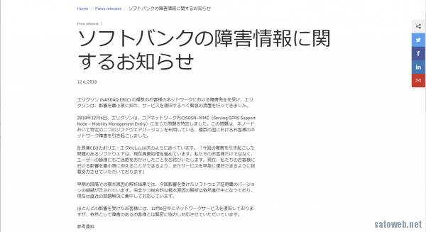 ・2018年12月6日に発生した携帯電話サービスの通信障害に関するおわび | プレスリリース | ニュース | 企業情報 | ソフトバンク
