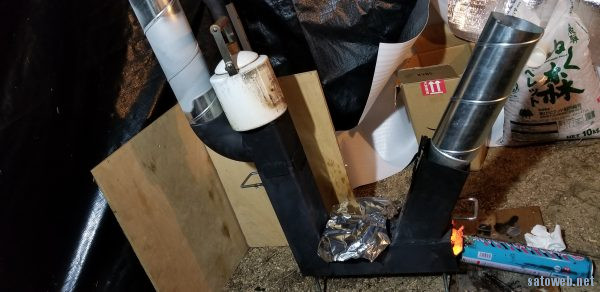 燃料を右側がら入れておくと 下で燃えて 燃料筒横と排気側の2箇所で熱が取れる設計。(要は適当)