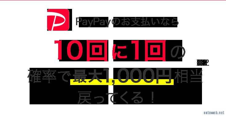 PayPayで支払ったら最大20%戻ってくる!同時開催中!やたら当たるくじは抽選で10回に1回の確率で最大1,000円相当戻ってくる!また、Yahoo!プレミアム会員なら確率が5回に1回に
