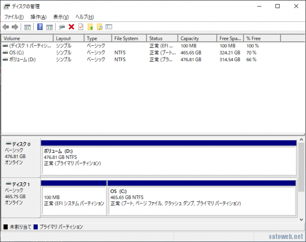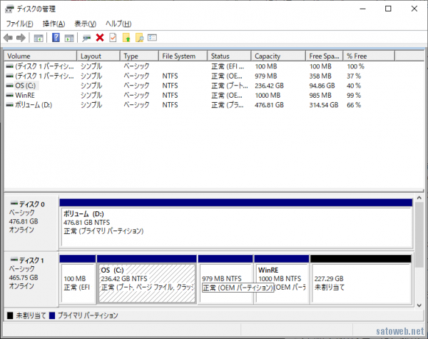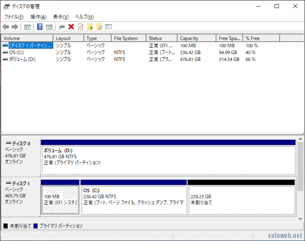 DISKPART> list disk ディスク 状態 サイズ 空き ダイナ GPT ### ミック ------------ ------------- ------- ------- --- --- ディスク 0 オンライン 476 GB 0 B * ディスク 1 オンライン 465 GB 227 GB *