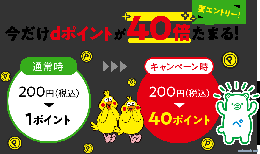 キャンペーン期間中、全国のファミリーマートの店舗(一部店舗除く)で、お会計の際にdポイントカード連携ファミペイ/dポイントカード/dカード GOLD/dカード/dカード プリペイド/モバイルdポイントカードのいずれかをご提示いただき、本キャンペーンサイトからエントリーされた方に、今だけdポイントが40倍たまる!要エントリー!