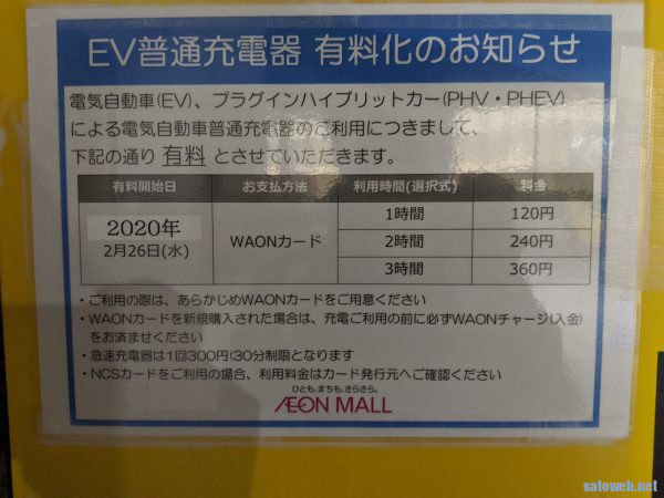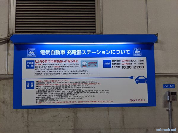 3時間無料(別途駐車場代)で充電できたイオンモールの普通充電が