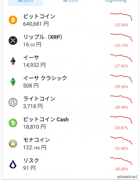 ここ1週間で1BTC97万円からの64万円とわりと激しいジェットコースターとなっているのが悲惨。