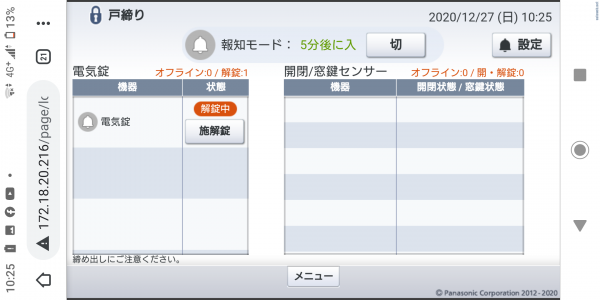 設定後「戸締り」メニューには電気錠の項目が現れる。