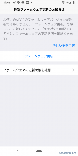 アップデート完了後 ファームウェアもアップデートしてくれの通知。
