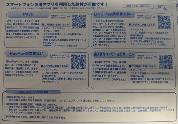 去年から堺市税であった軽自動車税はPaypayでの決済ができましたが