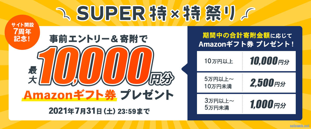 サイト開設7周年記念!SUPER特×特祭り 事前エントリー&寄附で最大10,000円分のAmazonギフト券 コードがもらえるキャンペーンを実施中です!