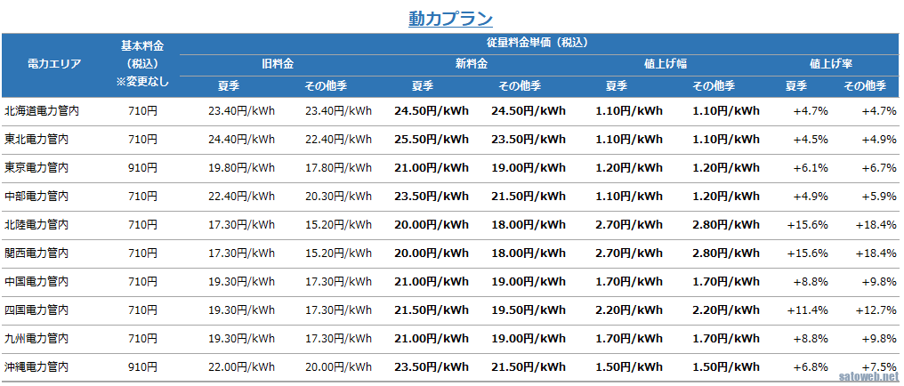 動力も値上げで関西電力・北陸電力エリアでは18.4%の値上げ。