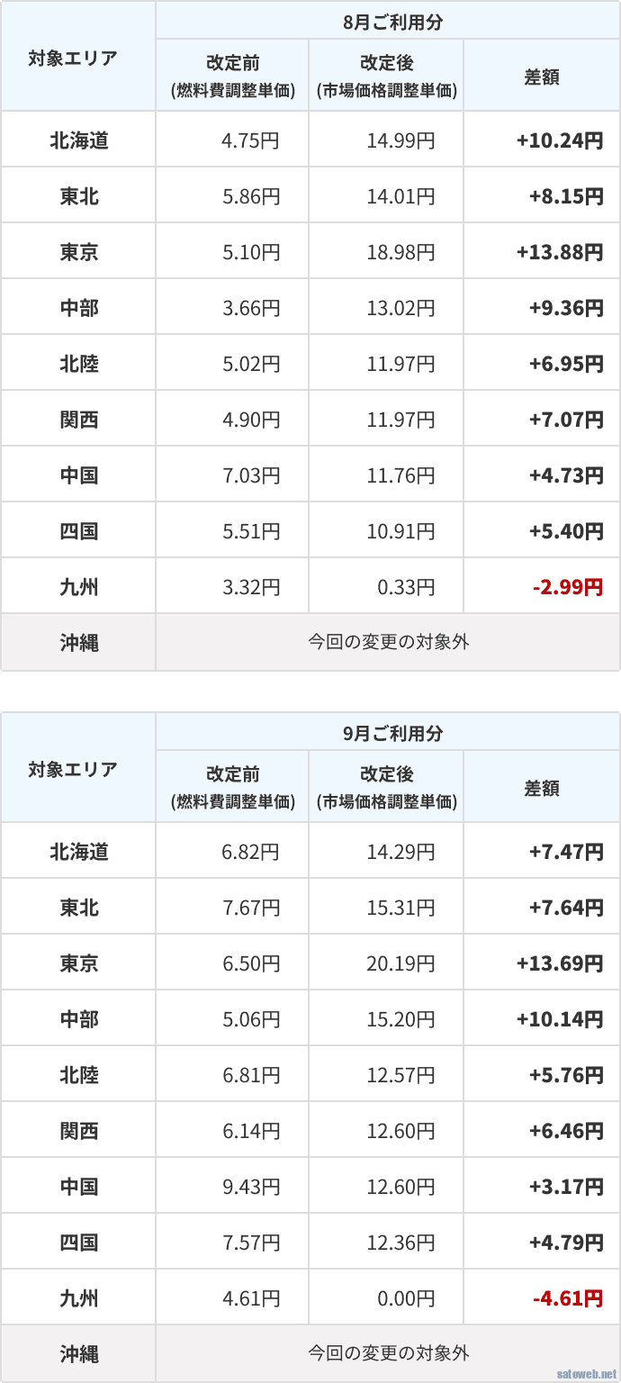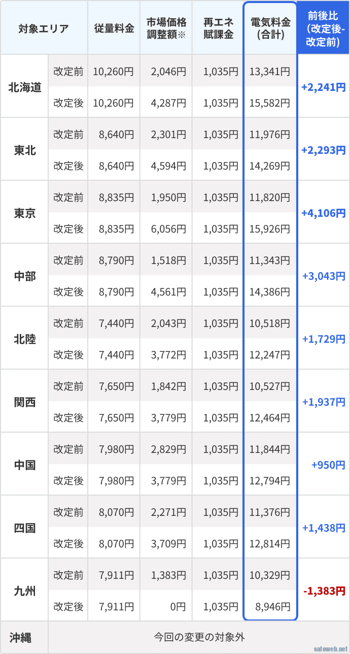 九州をのぞくほかのエリアでも+1500~3000円程度の負担増となる