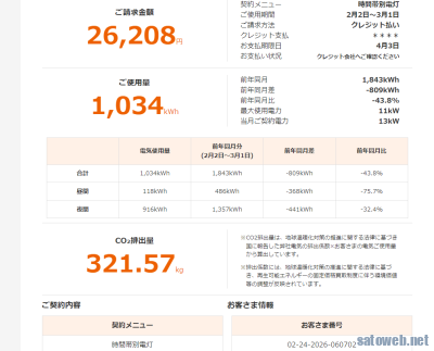 電灯(時間帯別電灯) 26208円 1034Kwh