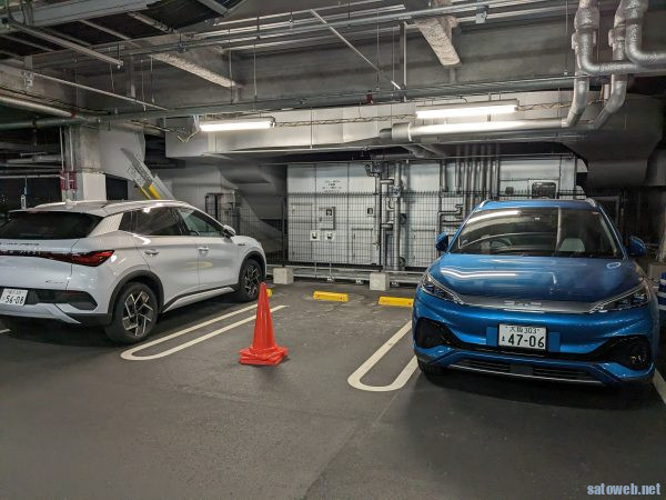 V2H放電ステーション・EV普通充電器の横にはATTOの試乗車?充電場もありわりとカオスな空間。