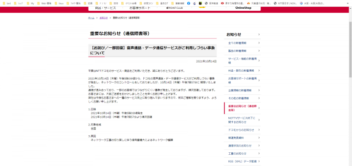 0 docomo 2021年10月14日 【ドコモ/MVMO】2021年10月14日 17時ごろより 音声通話・データ通信で障害。 障害のエリアは全国となっているものの すべての端末でおかしいというこ...